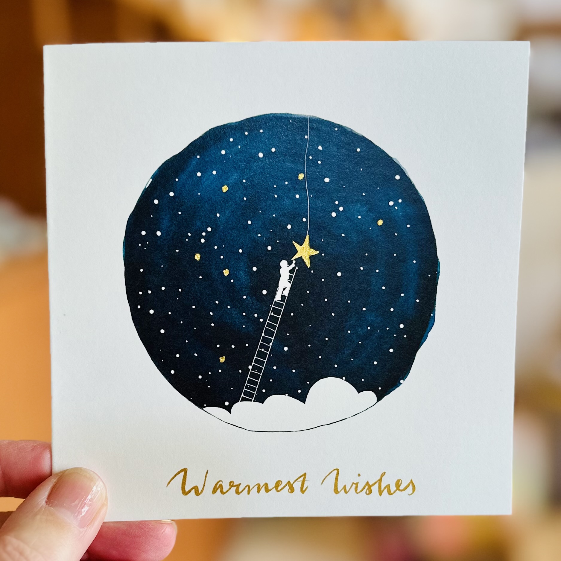 Deze kerstkaarten zijn speciaal ontworpen voor kerst 2025. De gouden sterren zijn er handmatig op geschilderd met goudverf, waardoor elke kaart een uniek kunstwerkje is waar ik stuk voor stuk persoonlijke aandacht in heb gelegd.